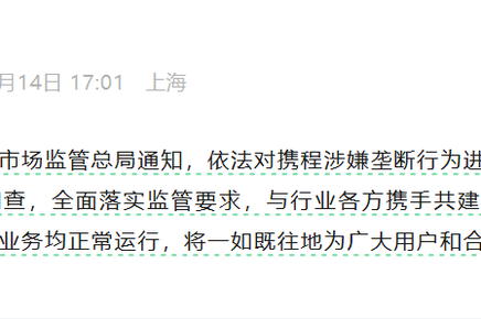 携程回应被立案调查:将积极配合监管部门调查,全面落实监管要求