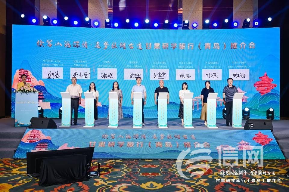 推介现场,甘肃省文旅厅、嘉峪关市、白银市及敦煌研究院进行了研学品牌形象、优势研学资源、特色体验课程及主题研学线路宣传推介。嘉峪关君和国际旅行社与港中旅国际(山东)旅行社,读者文化旅游有限责任公司与中国国旅(青岛)国际旅行社等8对16家企业签订了研学合作协议,约定加强交流与合作,加深沟通、增进友谊,努力推进政策互惠、资源互换、产品互推、客源互送、利益互享,共同促进两省研学业态健康发展,推动文化旅游大发展大繁荣。
