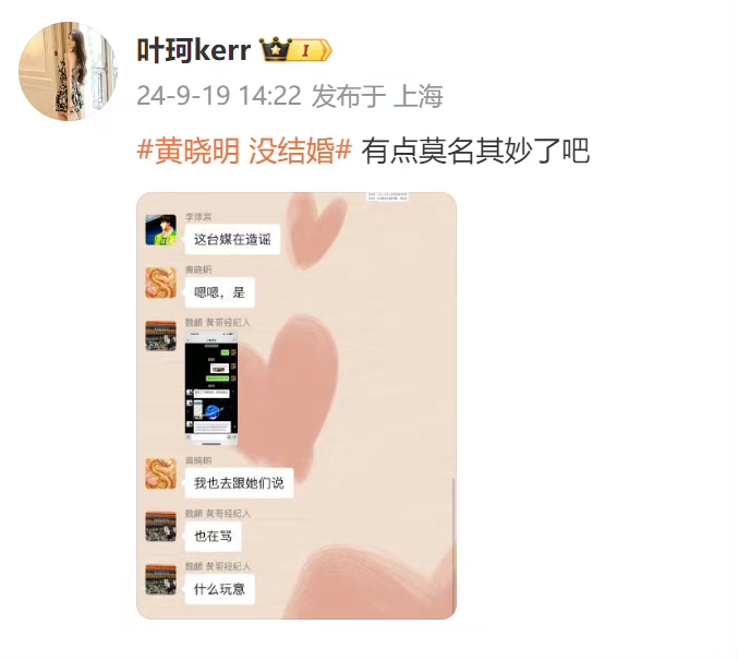 在台媒报道#黄晓明没结婚#的新闻后,叶珂晒出了黄晓明与团队的聊天记录,说“有点莫名其妙了。“截图中,叶珂丢了报道到群里,工作人员说是造谣,黄晓明说是,并表示:“你别做,我来做。”(信网记者)
