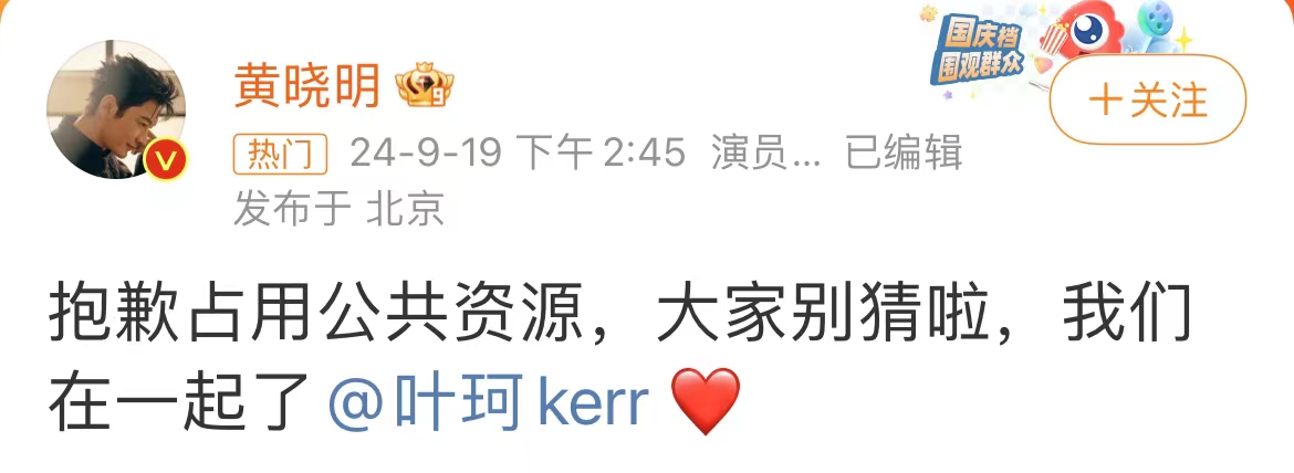 信网9月19日讯 9月19日,黄晓明在社交平台发文承认与叶珂恋情:抱歉占用公共资源,大家别猜啦,我们在一起了。