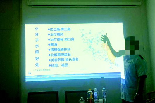 记者在耿女士提供的几段录像视频中看到,培训人员讲解了高血压等疾病对人体产生的严重后果。还有小分子水的好处:防三高、降三高;治疗痛风便秘,防口臭;解酒;清肺保肝护肾;化解肾胆结石等等。培训人员随后表示,他们有一种杯子原价999元,现在599元一个,可以把水分子变成小分子,对身体有好处。