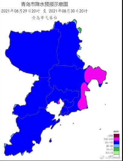 下图为8月29日20:00到30日20:00的降水预报示意图,仅供参考。了解最新气象信息, 请关注 @ 青岛气象