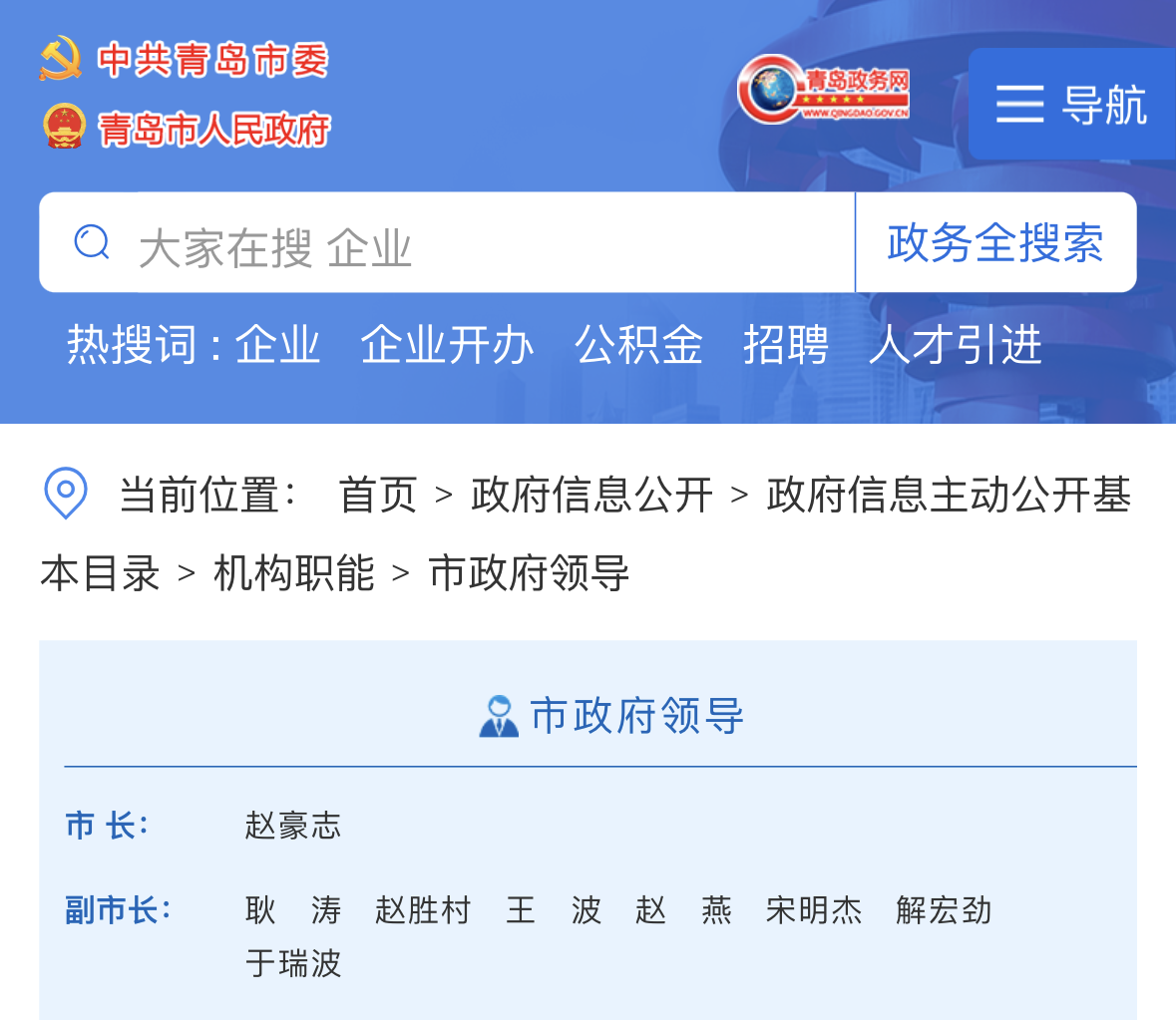 日前,青岛政务网更新了市政府领导信息,并公布了新一届市政府领导班子的具体分工。