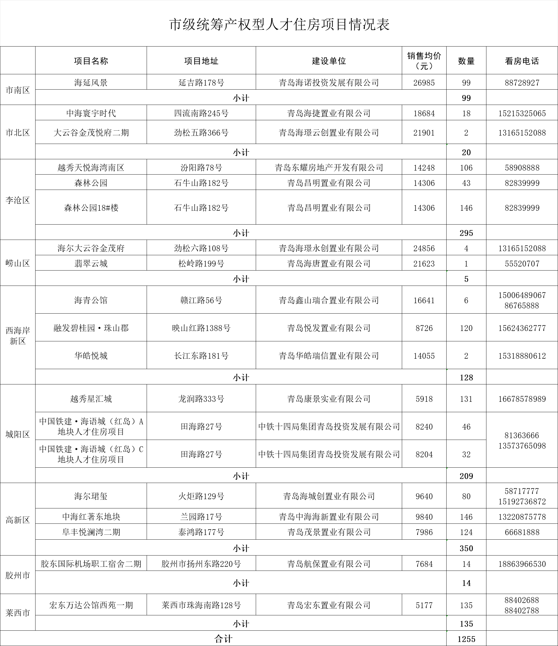 青岛发布最新市级统筹产权型人才住房项目情况表 共计1255套房源