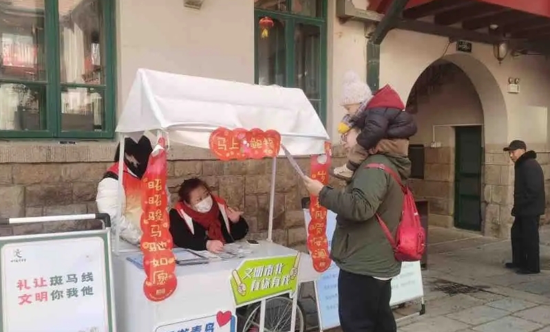 活动现场,志愿者们在广兴里主会场及周边人流密集区域开展常态化文明风尚宣传倡导,围绕文明出行、文明旅游、文明餐桌、文明观演、移风易俗等内容,向市民游客发放《青岛文明旅游宣传手册》《文明旅游倡议书》和文明餐桌、文明交通、文明养犬等宣传材料,提醒市民游客有序排队、爱护环境、节约粮食、遵守公共秩序,用温馨提示与细致服务,引导大家争做文明风尚的传播者、践行者。