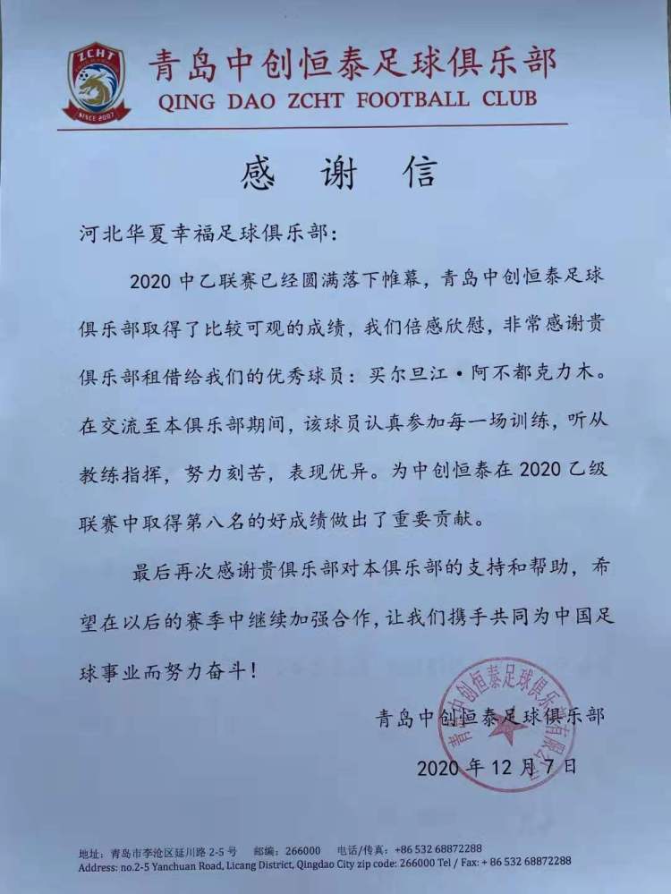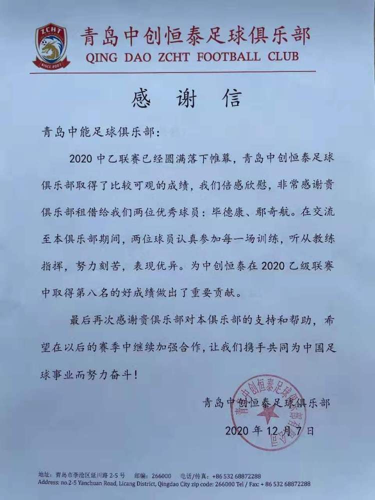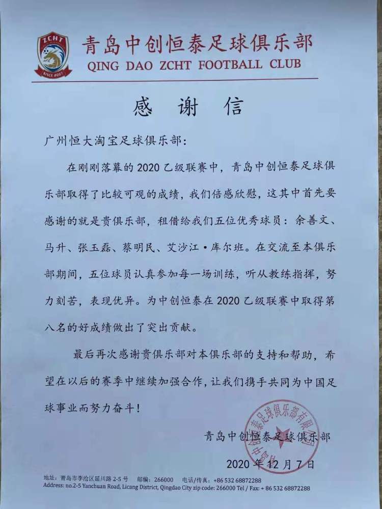 随着今年中乙联赛的征程结束,作为新军的青岛中创恒泰俱乐部取得了4胜2平3负排名泸西赛区第四名,中乙排名第八的好成绩,成为一匹大黑马。在确定参加中乙准备时间不长的情况下,该队租借过来的不少球员发挥都十分出色。近日,该俱乐部向这些租借球员的东家青岛中能、广州恒大淘宝以及河北华夏幸福发送了感谢信。