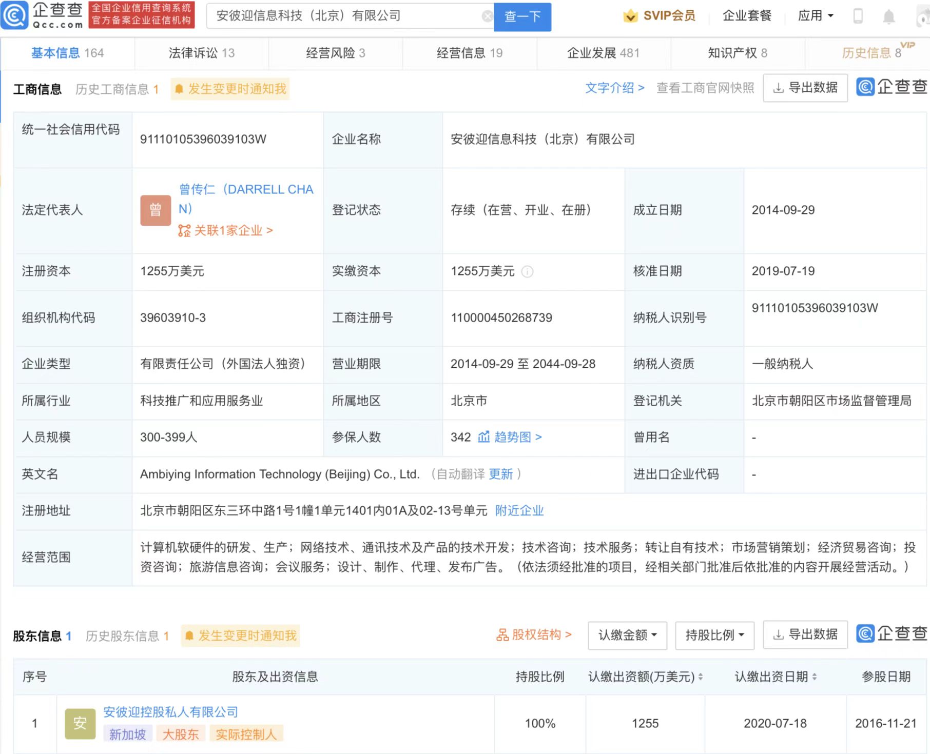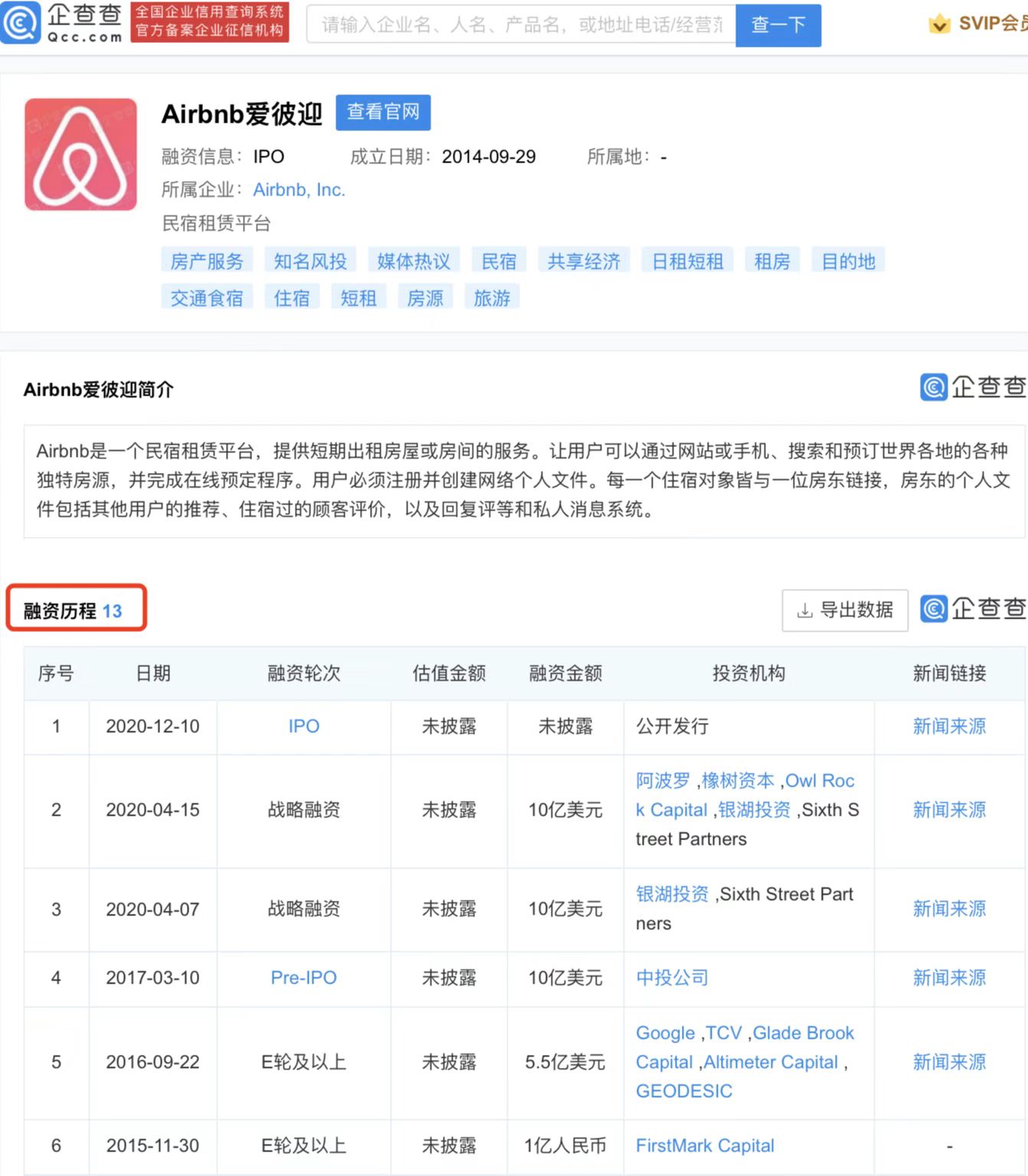 企查查显示,爱彼迎是一个民宿租赁平台,提供短期出租房屋或房间的服务。让用户可以通过网站或手机、搜索和预订世界各地的各种独特房源,并完成在线预定程序。其目前已融资13轮,投资方包含中投公司、阿波罗、橡树资本、银湖投资等。企查查信息显示,爱彼迎关联公司安彼迎信息科技(北京)有限公司成立于2014年,法定代表人为曾传仁,注册资本1255万美元,经营范围包含:计算机软硬件的研发、生产;网络技术、通讯技术及产品的技术开发等,由安彼迎控股私人有限公司100%持股。此外,该公司间接持股企业共97家。