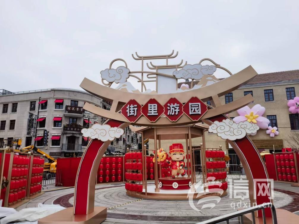 百年历史街区同样沐浴在新春将至的喜乐氛围中。游游走走,巨幅“2024青岛·市南第二届新春逛街里节”的海报不时映入眼帘,小吃排档顶棚一角悬挂着的红灯笼“逛街里·游园会”随风摇曳。