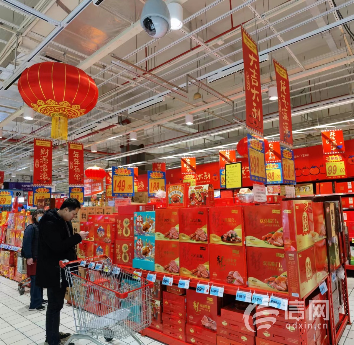 宁夏路大润发卖场内每个品类展区都悬挂着红彤彤的醒目促销信息,新年碗盘、年节饰品、饮料酒水、酱货糖果等琳琅满目。