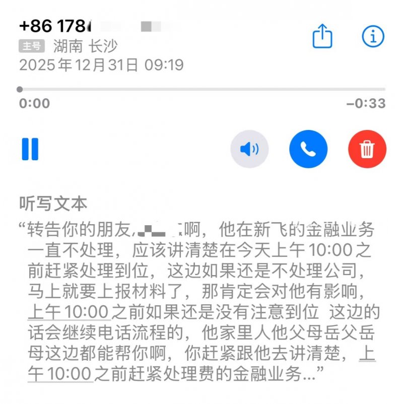 在方女士2025年12月31日收到的一段语音信箱留言中,催收人员要求“限当日上午10点前必须处理完‘信用飞’金融业务”,同时声称若未处理将上报材料,会对贷款人产生影响。催收人员还暗示方女士可联系贷款人父母、岳父母协助还款,若未按时处理则会继续电话催收。