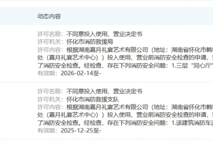 公开信息显示,湖南嘉月礼宴艺术有限公司曾两次向消防部门提交嘉月礼宴艺术中心投入使用、营业前消防安全检查的申请,申请结果均为不同意。2026 03/23 23:05 -- 来源: 信网